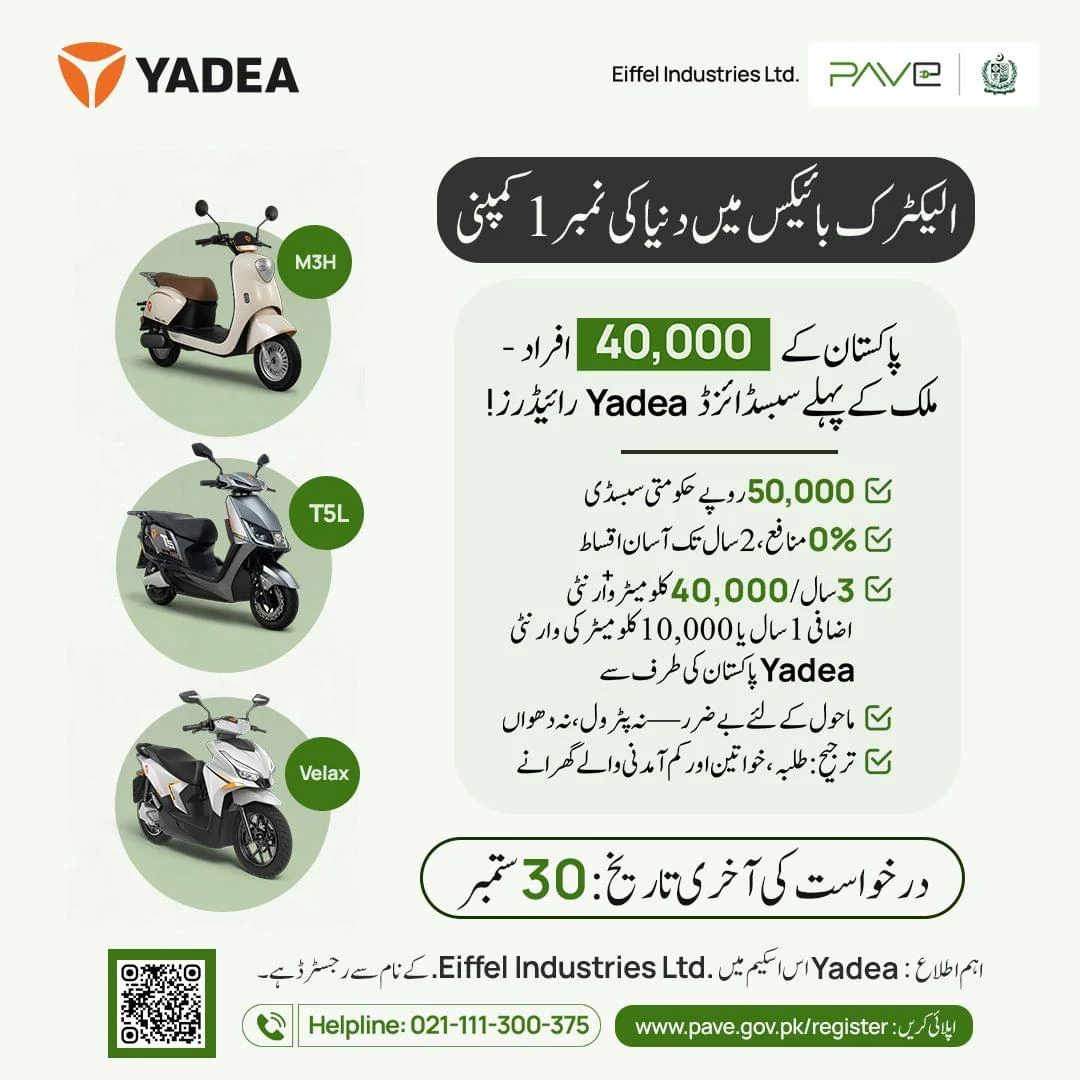 Customers interested in availing this Yadea Electric Bike 0% Interest Offer can apply through the official PAVE portal at www.pave.gov.pk/register